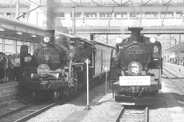 右の列車、C11325号機牽引のSL会津只見号