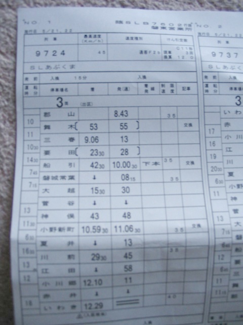 SLあぶくま号 ダイヤ時刻札 下り 郡山