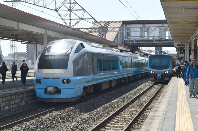 右、E653系1000番台、基本U107編成(元K307編成 いなほ転用)